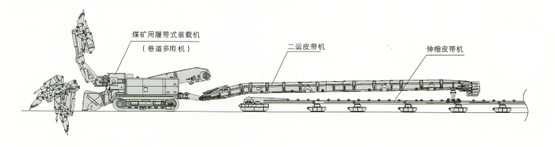 二运转载皮带机通过其可伸缩的桥式结构,前端与采掘机尾部铰接,后端通过支撑小车搭在主运输线的轨道上。当采掘机前进时,会牵引二运机一同移动,直至其最大搭接长度用尽,再延伸主运输设备。